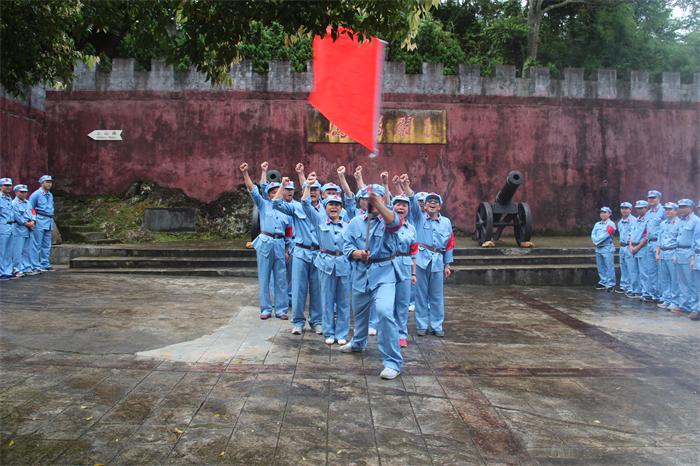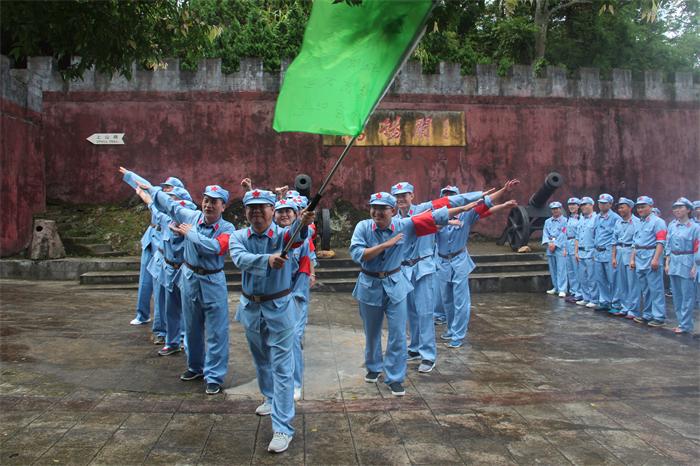 “七一”前夕,城投集團(tuán)全體黨員身穿紅軍裝,頭戴紅軍帽,腰系紅軍帶,分乘兩部大巴,雄赳赳氣昂昂前往鷹揚(yáng)關(guān)。
