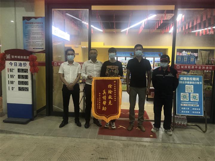 10月20日, 道東小涼河城東店屋主送來錦旗,感謝平安加油站員工10月16日上午對其宵夜店發生火情,及時救助、見義勇為事件表示感謝。能源公司在家領導童杰新接受錦旗。