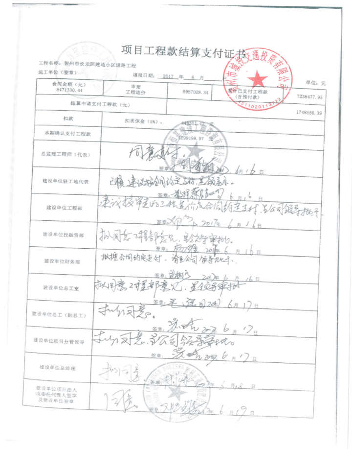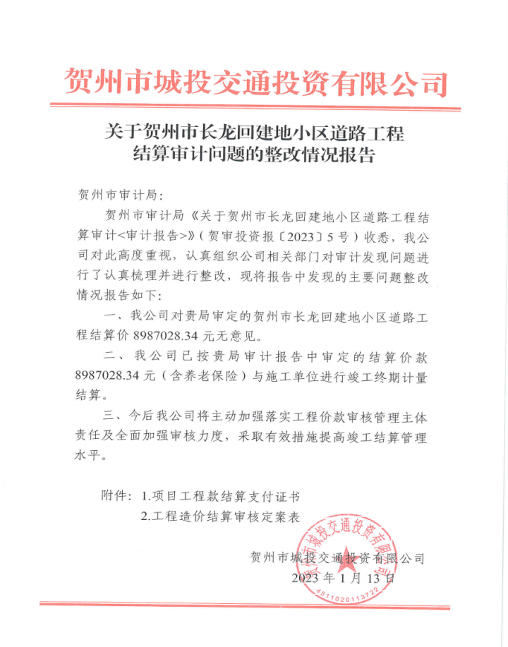 城投集團關于賀州市長龍回建地小區道路工程結算審計整改情況報告公示