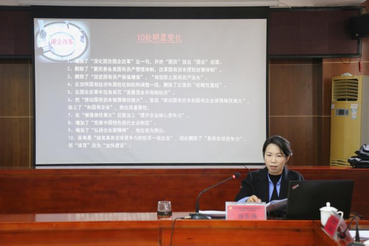 湯彩燕圍繞黨的二十大報(bào)告關(guān)于國(guó)企改革的重要論述和部署進(jìn)行系統(tǒng)宣講,深入解讀了黨的二十大報(bào)告對(duì)國(guó)企改革提法上的變化以及二十大報(bào)告標(biāo)志了國(guó)企改革的八大趨勢(shì)等內(nèi)容。她表示,習(xí)近平總書(shū)記在黨的二十大報(bào)告中,對(duì)深化國(guó)資國(guó)企改革作出了新的重大部署,對(duì)于國(guó)資國(guó)企改革的時(shí)代背景、方向、使命任務(wù)、目標(biāo)、途徑、要求做出表述,有清晰的時(shí)代感與厚重的實(shí)在感,為全面建設(shè)社會(huì)主義國(guó)家新征程國(guó)有企業(yè)改革指明了方向、提供了根本遵循。