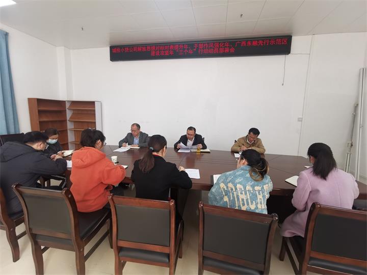 小貸公司召開本公司“三個年”動員部署會,要求公司上下要進一步解放思想,強化作風建設,重實效、強實干、抓落實,以“三個年”活動為抓手,聚焦信貸業務發展加油干、強化風險防控不松勁、改進干部作風不停步,以作風的轉變推動公司高質量發展。