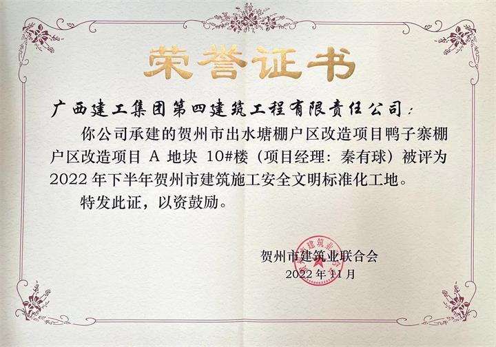 打造“高標準”文明工地。以標準化制度為主線,實現人員“進場流程、安全檢查、安全設施、安全防護”標準化,建立13個在建項目微信交流群,每日報送項目建設情況,全方位推進文明工地建設。公司實施的平安居棚改項目、出水塘鴨子寨棚改項目均榮獲“2022年下半年賀州市建設工程施工安全文明標準化工地”。