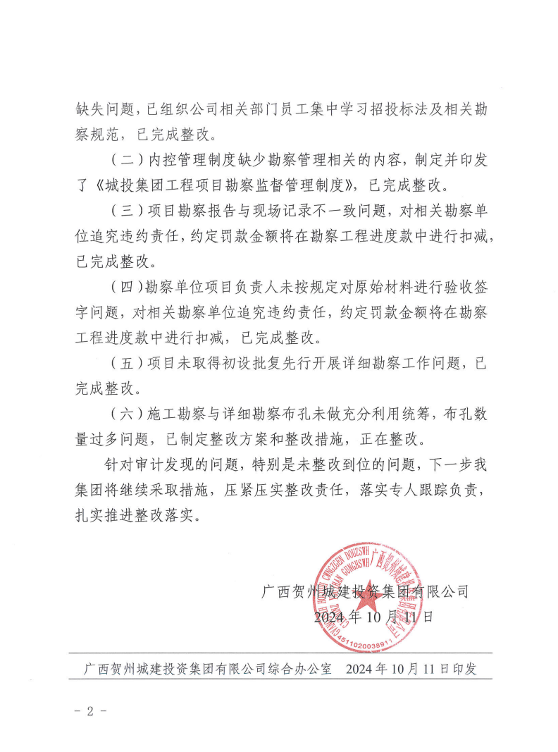 廣西賀州城建投資集團有限公司關于審計整改結果情況的公告